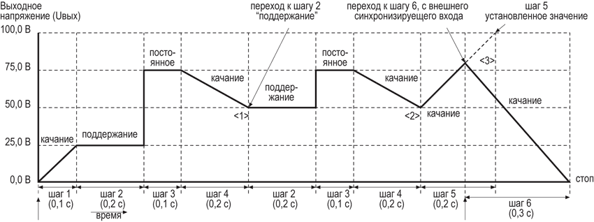 Источник APS-71102 имеет функцию быстрого перехода к различным шагам во время отработки последовательности. Все данные о шаге последовательности (время старта/ остановки качания или поддержании напряжения) сохраняются в памяти и могут быть запрограммированы пользователем на автоматическое воспроизведение в произвольном порядке (на рис.5 – точки <1>, <2>, <3>).