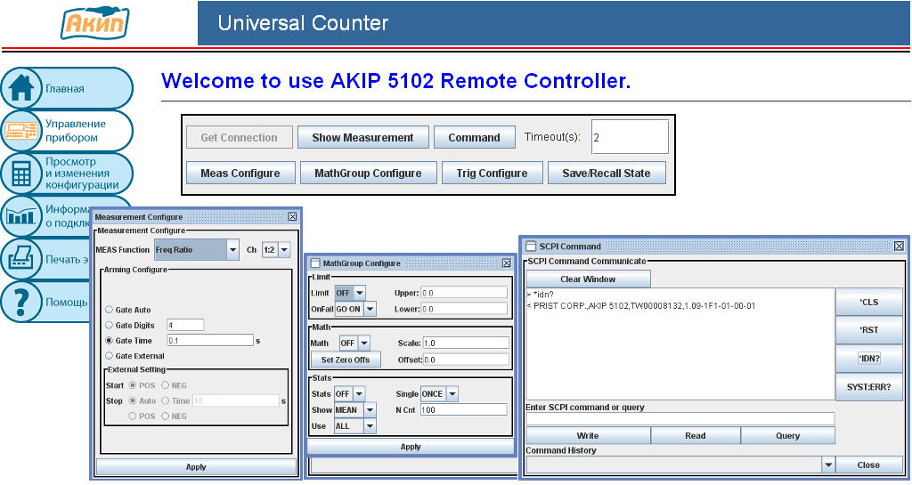 Функциональность частотомера АКИП-5102 характеризуется реализацией Web-интерфейса дистанционного управления. Пользователи имеющие доступ к данному прибору, таким образом, могут легко управлять им по локальной сети (рис. 4), путём ввода IP-адреса прибора в окне браузера. Дистанционное управление частотомером производится с помощью стандартных команд SCPI (Standard Commands for Programmable Instruments).
