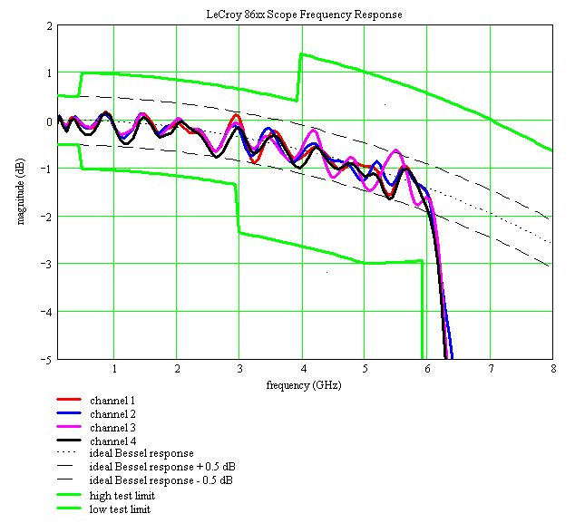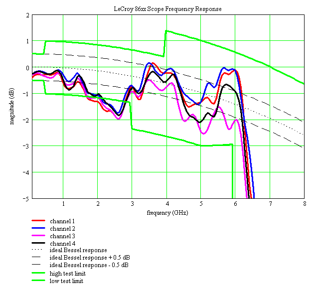 Эти начальные характеристики могут даже рассматриваться как вполне приемлемые и полоса осциллографа по уровню (-3) дБ соответствует заявленной. Однако, из рисунка видно, что АЧХ не соответствует частотной характеристики идеального фильтра Бесселя и имеет значительные колебания между уровнями (-2) и (-3) дБ. Также АЧХ разных каналов имеют значительные расхождения на частотах свыше 3 ГГц, после которых колебания АЧХ и канальное согласование становятся очень плохими.