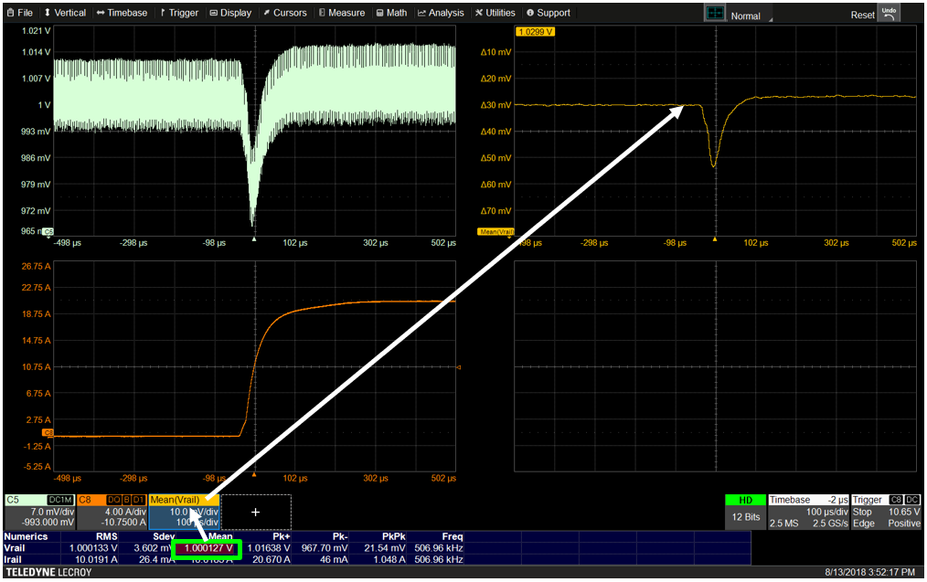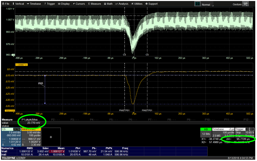 Кроме того, ПО облегчает измерение таких показателей, как время установления при включении нагрузки и время обратного восстановления до номинального напряжения, потому что точку начала и конца измерений легче выбрать на форме сигнала. Так как в противном случае у пользователя нет возможности визуального контроля за средним напряжением шины, значение которого расположено на кривой между линиями отсчетов пульсаций.