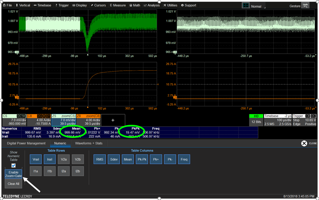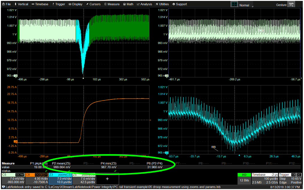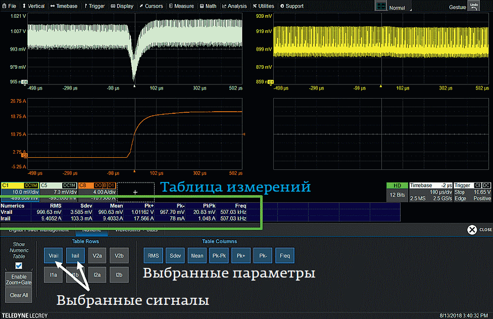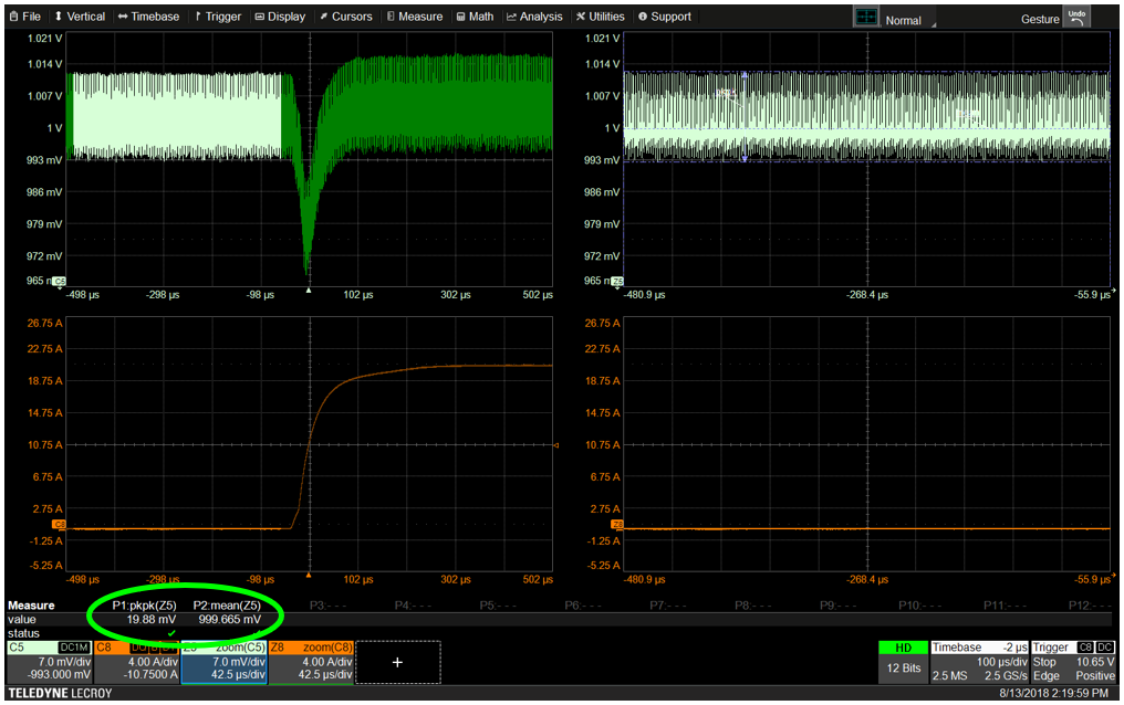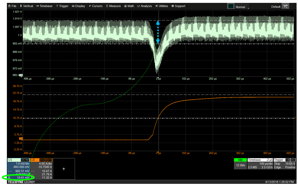 На Рис. 7 справа на экране показаны две растяжки (zoom C5 и zoom С8), которые отображают напряжение шины до включения нагрузки (светло-зеленый цвет) и уровень тока (оранжевый цвет) как увеличение соответствующих осциллограмм. Достоверно наблюдая на растяжке, что ток нагрузки еще не начал расти, это является подтверждением правильности выбора области выделения на форме сигнала для измерений.