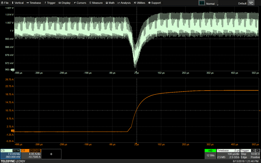 Достаточно широко используемый базовый метод измерений переходных процессов на шине питания при анализе отклика на нагрузку (Transient Response) заключается в применении осциллографа с функцией курсорных измерений.