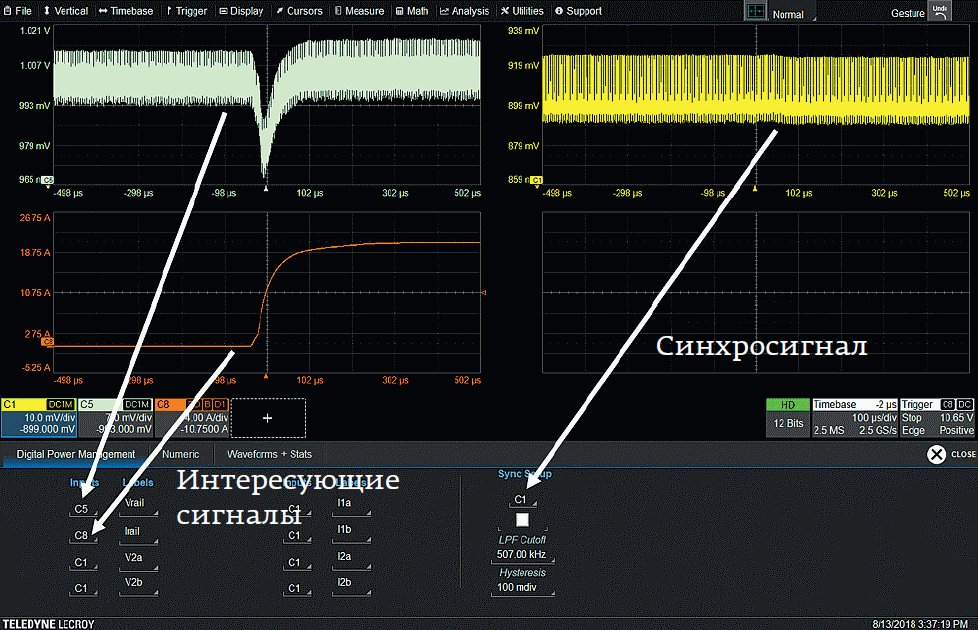 Наиболее точным методом анализа на шине электропитания являются измерения, выполненные с использованием программного обеспечения Teledyne LeCroy – «Digital Power Management» (ПО), которое предоставляет пользователю широкие возможности измерений и позволяет лучшее понимать происходящие процессы. Данное ПО позволяет проводить измерения интересующих нас сигналов для каждого цикла включения, для оценки изменения параметров шины питания в результате воздействия какого–либо определённого (интересующего нас) устройства. Учитывая это формулируется тезис данного способа тестирования: «При известной частоте ШИМ-преобразования, сигнал которого вероятно вызывает пульсации, необходимо обеспечить синхронизацию измеряемых сигналов с «агрессором» с целью наблюдения изменений в каждом их циклов» (Рис. 10). На данном рисунке - слева на экране представлены интересующие сигналы напряжения/ тока на шине - параметры С5/ С8 (соответственно), справа – меню настройки тактовой синхронизации с помехой (SyncSetup).