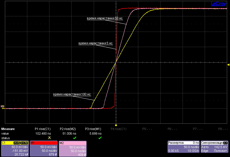 Генератор сигналов АКИП-3402 позволяет регулировать время нарастания и спада импульсного сигнала в пределах от 5 нс до 100 нс, так на рисунке 15 приведены примеры одного импульсного сигнала с тремя разными временами нарастания.