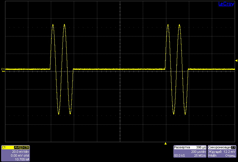 Формирование пакетов. Все современные генераторы сигналов сложной формы имеют возможность формировать пакеты сигналов (Burst). Пакет – это близкий аналог радиоимпульса, но его заполнение, в отличие от радиоимпульса, может быть не только синусоидальным сигналом, а любым сигналом, формируемым генератором – импульсным, пилообразным, треугольным и пр. Основными параметрами в этом режиме являются – максимальная частота заполнения, число циклов заполнения, период повторения пакета. У большинства генераторов сигналов сложной формы в этом режиме существуют серьёзные ограничения вышеуказанных параметров. Например, для генераторов ГСС-05…ГСС-120 минимальная длительность пакета составляет 25 мкс или это означает, что одиночный импульс не может иметь частоту выше 40 кГц, к тому же для генераторов ГСС-05…ГСС-120 заполнение пакета возможно только синусоидальным сигналом. Генератор АКИП-3402 не имеет такого функционального ограничения и позволяет формировать пакеты со всеми формами сигналов в качестве заполнения, кроме модулированных сигналов. Частота заполнения пакета ограничена 10 МГц, но этого вполне достаточно для большинства приложений. Так на рисунке 16 представлен пакет из двух периодов синусоидального сигнала, симметричных относительно нулевой линии.
