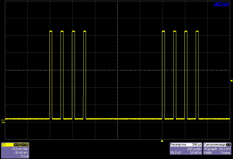 Интересным для пользователя в режиме пакетов являются пакеты импульсных сигналов. Как известно, любой импульсный генератор, помимо формирования одиночных или периодических импульсных сигналов имеет возможность формирования парных импульсов – двух близко расположенных импульсов с регулируемым временем задержки между импульсами и регулируемым периодом повторения таких пар. Очевидно, что парный импульс – это пакет из 2-х импульсов, формирование которых не представляет никакой сложности для генератора сигналов произвольной формы. И более того, генератор сигналов произвольной формы АКИП-3402 может формировать посылки из трёх, четырёх, пяти и т.д. до 50000 импульсов, что недоступно для большинства импульсных генераторов. Это преимущество, безусловно, значительно расширяет области возможного применения генератора АКИП-3402. Пример формирования посылки их четырёх импульсов приведён на рисунке 17.