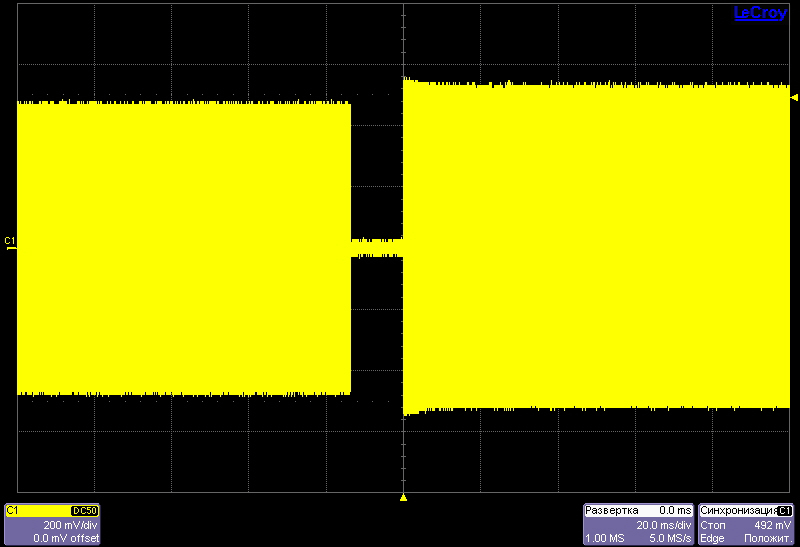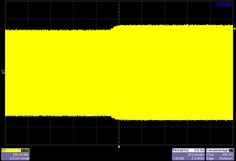 Целостность сигнала при изменении уровня. Выходные каскады генераторов сигналов специальной формы представляют собой комбинацию нескольких усилителей и аттенюаторов, позволяющих получить требуемых уровень на выходе генератора. Используя комбинации усилителей и аттенюаторов, пользователь имеет возможность регулировать выходной уровень в очень широких пределах. По умолчанию генератор автоматически выбирает наиболее оптимальную комбинацию усилителей и аттенюаторов, во избежание появления излишних шумов в выходном сигнале. При изменении выходного уровня комбинация задействованных усилителей и аттенюаторов тоже изменяются. Это приводит к кратковременному провалу в выходном сигнале в момент механического переключения аттенюаторов. Так на рисунке 18 приведён пример осциллограммы изменения выходного уровня генератора от 900 мВ до 1000 мВ. Провал уровня по времени составляет около 15 мс.