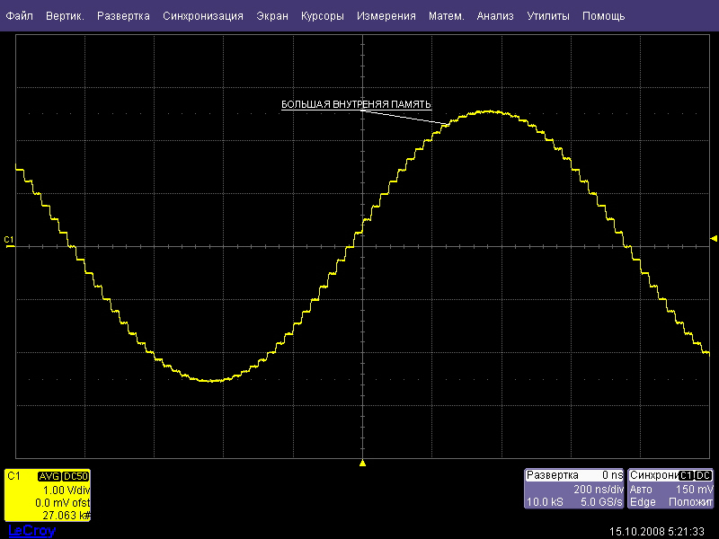 Одними из самых важных параметров генераторов сигналов специальной форм, помимо частоты дискретизации, определяющей максимальную выходную частоту, также являются длина внутренней памяти и вертикальное разрешение АЦП. Возвращаясь к принципу прямого синтеза, изложенного выше, и взяв в качестве примера формирование сигнала синусоидальной формы, можно утверждать, что вертикальное разрешение влияет на высоту ступеньки напряжения, а длина внутренней памяти на длину ступеньки напряжения. И чем более высокое разрешение имеет АЦП генератора и более длинную память, тем меньше будет размер этой ступеньки. И как следствие этого выходной сигнал будет иметь меньший уровень гармонических составляющих для синусоидального сигнала. При формировании сигналов сложной и произвольной форм более высокое разрешение АЦП и длинная внутренняя память позволяют формировать более сложный и «замысловатый» сигнал. Для наглядности на рисунке 3 приведены осциллограммы синусоидального сигнала с малым разрешением АЦП и длиной памяти (слева), а также с большим значением этих параметров (справа).