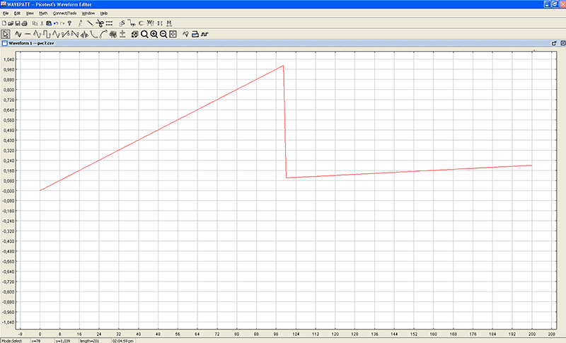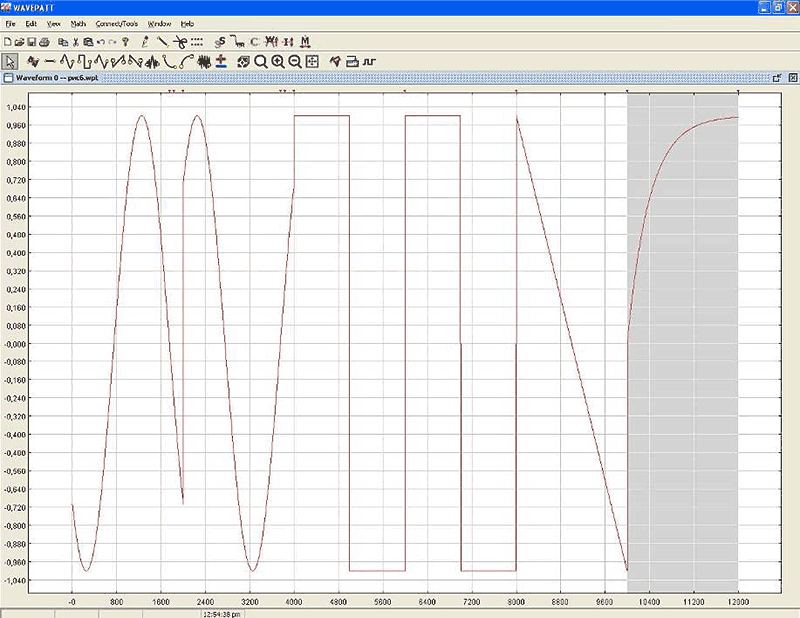- Загрузка форм из внешних файлов. столе ПО Wavepatt позволяет подгружать файлы данных созданных ранее в собственной оболочке, а так же файлы с расширением «csv». Файлы «csv» позволяют создавать собственные, «замысловатые» сигналы абсолютно любой формы. Файлы «csv» могут создаваться с помощью математических формул, описывающих различные процессы или в ручном режиме, исходя из требований пользователя. Файлы «csv» могут создаваться с помощью программы Excel, входящей в стандартный пакет Microsoft Office или с помощью программы MATLAB, имеющей более широкие возможности по моделированию произвольных форм сигналов. Загруженные файлы могут отдельно редактироваться средствами Wavepatt, описанными выше. Пример приведён на последовательности рисунков 7a, 7b, 7c.