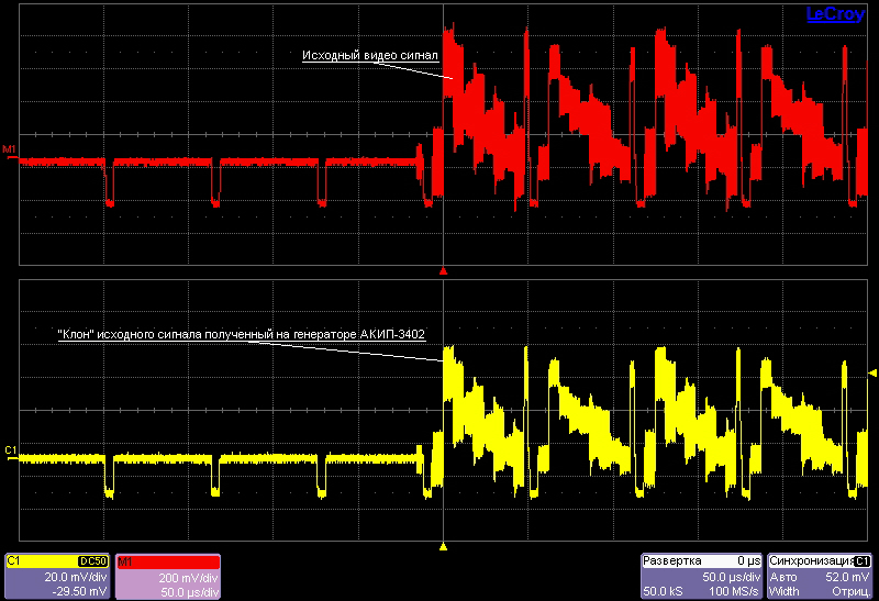 - Интересным в этом случае для практических приложений является связка цифрового осциллографа и генератора сигналов произвольной формы. Цифровой осциллограф, отображая входной сигнал - аналоговый или цифровой, способен записать его в файл с расширением «csv», далее этот файл открывается в программе Wavepatt и данные передаются в генератор АКИП-3402. Генератор формирует в точности такой же сигнал, какой отображается на экране осциллографа. Это весьма полезно при необходимости, когда осциллограф захватывает в реальных условиях редкий или одиночный сигнал и есть необходимость многократного воспроизведения этого специфического сигнала. Так на рисунке 8 приведён пример захвата первых четырёх строк видео сигнала, верхняя осциллограмма красного цвета –это «оригинальный» сигнал, нижняя осциллограмма жёлтого цвета – это осциллограмма последующего «клонирования» этих строк с использованием возможностей ПО и генератора АКИП-3402.