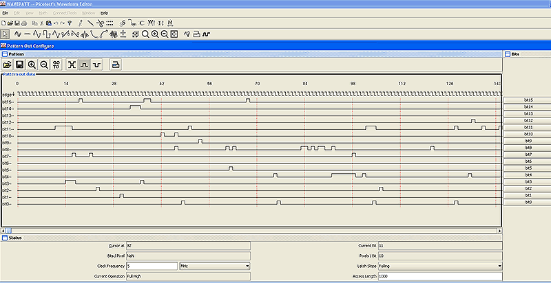- Помимо аналоговых сигналов программное обеспечение Wavepatt позволяет создавать и сигналы 16-ти разрядной цифровой шины (они выводятся на отдельный разъём расположенный на задней панели генератора). Логические сигналы привязаны к тактовому генератору, частота которого, в свою очередь, задается пользователем в оболочке программы. Пример изображения при конструировании цифровой шины в оболочке ПО Wavepatt приведён на рисунке 9.