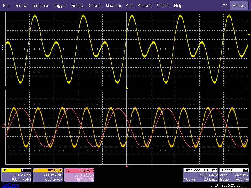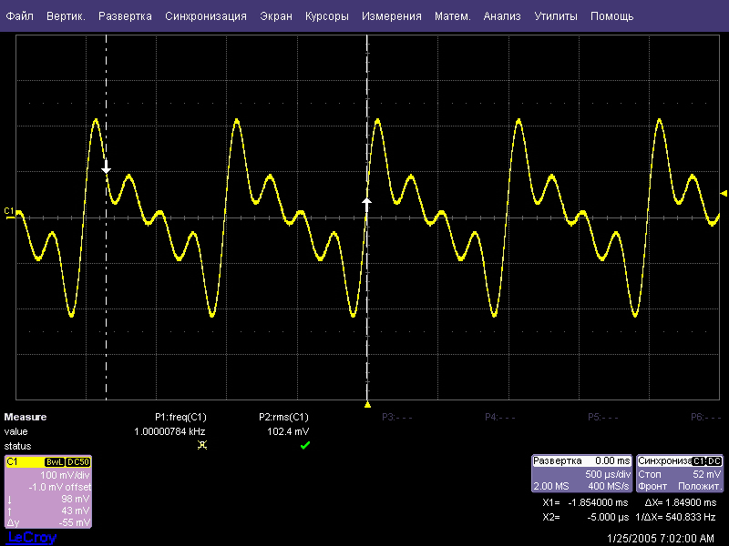 Погрешность установки фазового сдвига между гармониками проверялась для сигнала с Кг = 100%, сформированного из основной и второй гармоники с нулевым фазовым сдвигом между ними. В качестве эталона использовался цифровой осциллограф WaveRunner 6050A с программным обеспечением математической реализации цифровых фильтров. Сигнал с генератора подавался на вход осциллографа, оцифровывался и независимо пропускался через цифровые режекторные фильтры с частотами 1 кГц и 2 кГц (рис. 2). На выходе фильтров получались две синусоиды основной и второй гармоники. По осциллографу измерялся временной интервал между этими сигналами. В данный результат вносились поправки на фазовые сдвиги, вызываемые фильтрами, которые определялись путем измерения временного интервала между фронтами “чистой” синусоиды частотой 1 или 2 кГц и этой же синусоиды, прошедшей режекторные фильтры 2 или 1 кГц соответственно. Полученное после внесения поправок значение временного интервала переводится в значение фазового сдвига. Естественно, что нулевой фазовый сдвиг соответствует нулевому временному интервалу. Полученное расхождение составило не более 1 мкс, что соответствует фазовому сдвигу не более 0,3 градуса: