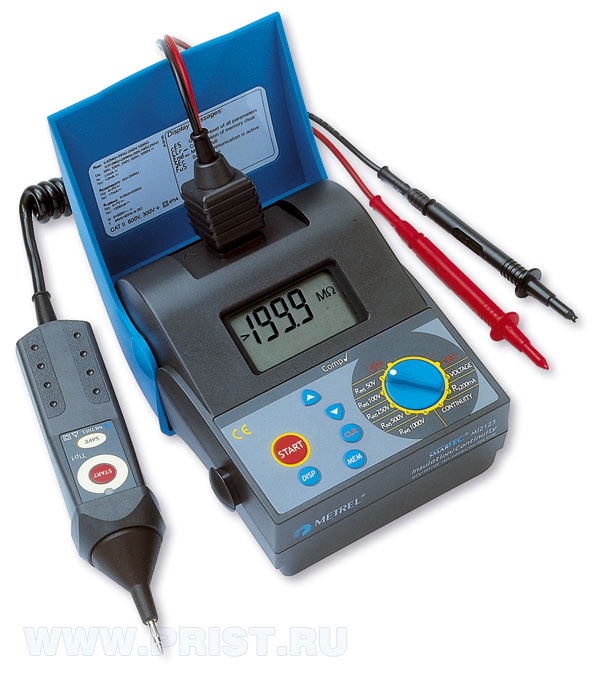 Измеритель сопротивления изоляции. Две модели прибора, отличающиеся наличием у MI 2123С щупа-пробника с функцией управления тестом. Прибор позволяет измерять сопротивление изоляции в широких пределах (от 0,012 МОм до 20 ГОм), используя тестовые напряжения от 50В до 1000В. В приборе имеется очень полезная функция низковольтного измерения сопротивления (0 – 2000 Ом) с учетом индуктивной составляющей, поскольку, в основном, подобные приборы предназначены для измерения только активного сопротивления. А также, есть функция компенсации сопротивления измерительных проводов до 5 Ом, что повышает точность измерения. Помимо этого, прибор работает как обычный вольтметр и позволяет измерять напряжение в сети (постоянное и переменное) до 600 В.