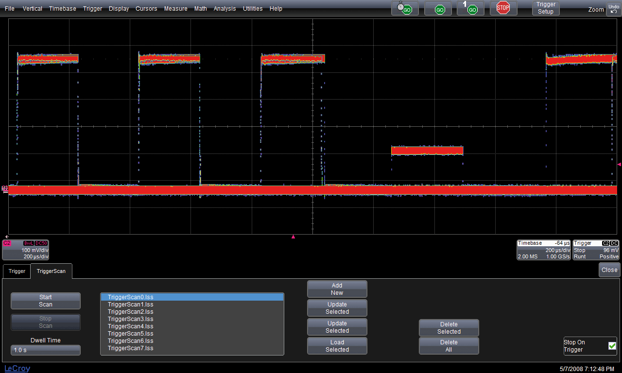 Для поиска аномалий в сигнале и отладки процессов в осциллографах WavePro 7 Zi применена система синхронизации TriggerScan. Данная система является уникальным решением по поиску аномалий и даёт значительный выигрыш по сравнению с технологией «быстрого обновления экрана» на частотах свыше 50 МГц и при временах наблюдения свыше нескольких минут. TriggerScan является программно-аппаратным решением, использующим специальную высокоскоростную микросхему предзапуска, и позволяет проводить сканирование сигнала по различным комбинациям условий запуска: по фронту, по интеллектуальным условиям запуска (глич, рант, длительность импульса и т.д.), по последовательностям данных. Таким образом, запуск прибора происходит, если входной сигнал удовлетворяет, хотя бы одному условию запуска из заданной комбинации (всего возможно до 100 комбинаций). Осциллографы серии WavePro 7 Zi способны захватывать практически любые аномалии. Этого удалось добиться благодаря тому, что интеллектуальные схемы синхронизации SMART работают с длительностями сигнала от 200 пс, большинство из них могут использовать технологию исключения (в отличие от обычных схем запуска технология исключения даёт срабатывание, если сигнал НЕ соответствует заданным условиям), а также применению системы TriggerScan (рис. 4) в совокупности с алгоритмом поиска аномалий WaveScan и специальным сегментированным режимам развёртки. Для упрощения работы с данным режимом, в осциллографе уже предусмотрены наиболее распространённые комбинации условий запуска, позволяющие обнаруживать до 80% всех требуемых сигналов.