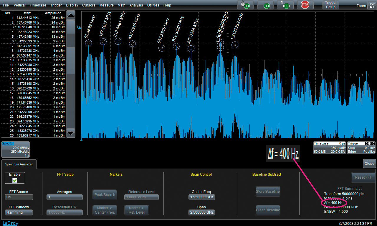 Как и все осциллографы от LeCroy, WavePro 7 Zi обладает широким набором инструментов по анализу сигналов - измерения (на сигнале, на математике, параметров сигнала и т.д.), математика (включая посторенние цепочек математических функций), графический и статистический анализ, интеграция с программными пакетами типа MatLab – всего этого в WavePro 7 Zi стало ещё больше. Например, расчёт БПФ теперь может вестись по 50 миллионам точек, что даёт ультравысокое разрешение по частоте, а специальная опция SPECTRUM (рис. 6) позволяет осуществлять настойки БПФ как при работе с обычным анализатором спектра – центральная частота, полоса обзора, полоса пропускания и т.д. При этом данный режим запускается совместно с WaveScan и сразу же выдаются значения всех спектральных пиковых значений по их частоте и уровню.