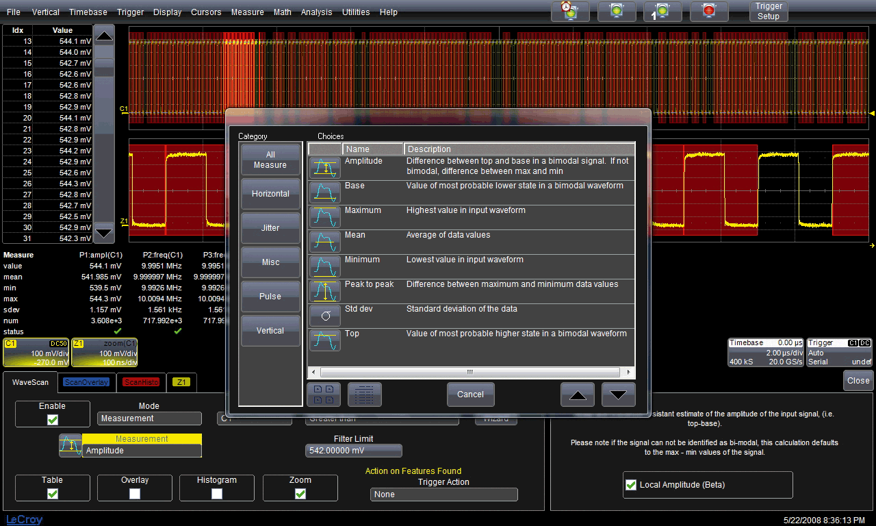 Режим интеллектуального поиска участков сигнала по заданным условиям WaveScan (рис. 7), также претерпел изменения в сторону расширения функциональных возможностей. Если раньше имелись некоторые ограничения по поиску измерений амплитудных параметров сигнала, то теперь стало возможным задавать для всех условий поиска и эти данные, например амплитуда, действующее значение, СКЗ и др.