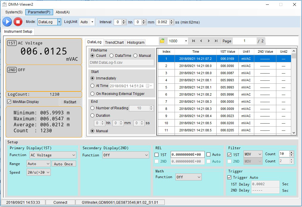 Компьютерное программное обеспечение DMM-Viewer2 поддерживает работу со всеми типами коммуникационных интерфейсов (RS232C/ LAN/ USB/ GPIB) предлагаемыми в серии GDM-7906X для Д/У и долговременного сбора данных. Программное обеспечение не только позволяет операт ору управлять параметрами настройки вольтметра, но также обеспечивает он-лайн наблюдение измерений или режим цифрового регистратора для записи данных. В режиме «Отображение» измеряемый параметр непосредственно представлен как итоговое значение, график тренда или гистограмма, при этом эти результаты не могут быть сохранены. В функции «Регистратор» результаты измерений сохраняются непосредственно в файл логгера, но в процессе записи на экран выводится только текущее значение. Измеренные данные (массив отсчетов) и диаграмма тренда могут быть рассмотрены оператором только после остановки режима записи. Также в комплекте поставки серии GDM-7906X предоставлен драйвер LabVIEW для удовлетворения требований ПО в приложениях системной интеграции прибора. (рис. 5)