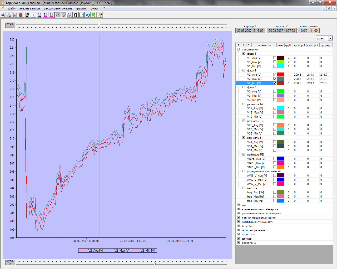После выгрузки отсчетов регистрации доступно их представление в графическом виде (форма сигнала U/I/P, графики, гистограммы) или в виде сохраненных экранов с отображаемыми значениями измеренных параметров.