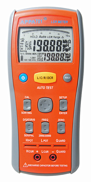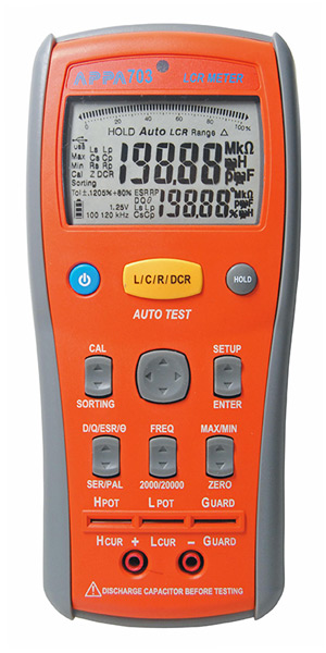 Новые RLC-измерители имеют набор фиксированных значений частот тестового сигнала: APPA 701 - 100 Гц, 120 Гц, 1 кГц, 10 кГц; APPA 703 - 100 Гц, 120 Гц, 1 кГц, 10 кГц и 100 кГц. В обоих измерителях реализована инновационная технология автоматического выбора режима измерений между L/C/R в зависимости от типа подключаемого компонента/радиодетали (с одновременной индикацией параметра Q/D). Достаточно только включить прибор, подключить объект измерений к входным гнёздам и нажать кнопку «AutoTest» – всё остальное прибор сделает сам автоматически. При необходимости пользователь выбирает требуемую схему замещения или изменяет параметры теста: частоту и уровень сигнала.