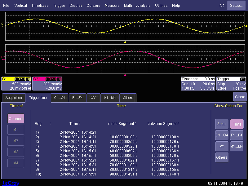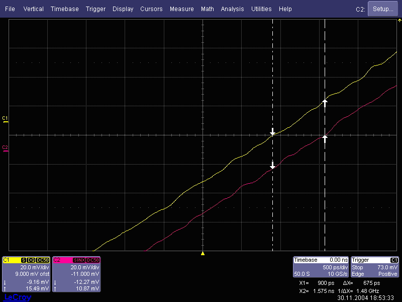 Для проверки результатов, полученных на частотомере, измерения по методу временных интервалов проводились и на цифровом осциллографе, имеющем максимальную разрешающую способность с использованием интерполятора менее 2 пс в реальном времени. В последовательном режиме формировалось 10 сегментов, каждый из которых содержит осциллограмму однократного запуска, с временем между сегментами 10 с (рис. 2). При этом для уменьшения случайной погрешности из-за шумов аналого-цифровой преобразователь в точке уровня запуска измерения проводились при повышенной чувствительности тракта вертикального отклонения и компенсации начального временного сдвига между каналами (рис. 3). Сравнение полученных данных для частотомера и осциллографа показывает, что возможно достигнуть значения погрешности в измерении временного интервала около 5 пс, что на интервале в 100 с дает погрешность сличения частот не более ± 3×10-14.