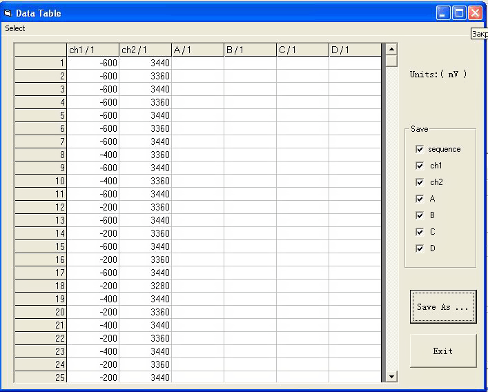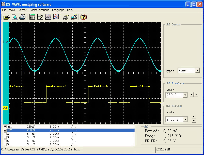 Возможности DS Wave, поставляемого в комплекте с прибором АКИП-4102 заслуживают отдельного комментария. Пользователь имеет возможность записи осциллограмм в формат программы (*.bin), вызова осциллограмм из памяти осциллографа (из сохранённого файла), сохранения данных в виде отсчётов (*.txt), масштабирования осциллограммы по вертикали и горизонтали при помощи изменения Кразв/ Коткл, перемещение осциллограмм.