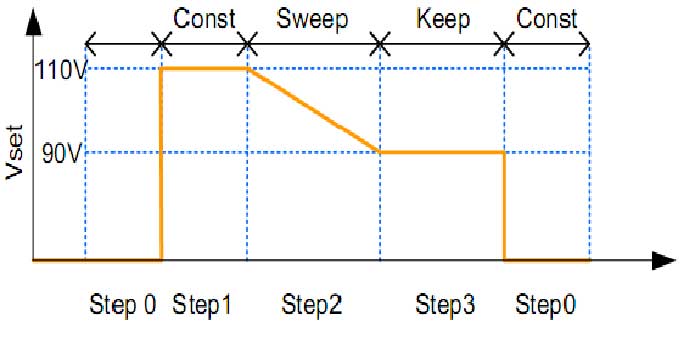 Функция установки скорости нарастания напряжения, позволяет устанавливать скорость нарастания или падения выходного напряжения, которая основана на времени (1 мс) или уровне (1 В).