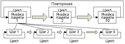 Режим программирования предназначен для выполнения группы тестовых последовательностей. Функция Программирования позволяет работать с различными этапами памяти последовательно. Каждый шаг программы является предустановленной конфигурацией в памяти. Каждая ячейка памяти состоит из 9 шагов, и каждая программа может состоять из 50 ячеек памяти. Программа будет выполнять каждую ячейку памяти последовательно, которая в свою очередь будет выполнять последовательно каждый шаг ячейки, до тех пор, пока программа не будет остановлена или шаг в программе запрограммирован на окончание. Каждая ячейка памяти, каждый шаг или программа в целом может быть запрограммирована на циклические повторения, определяемые пользователем. Основа программы показана ниже на структурной схеме: