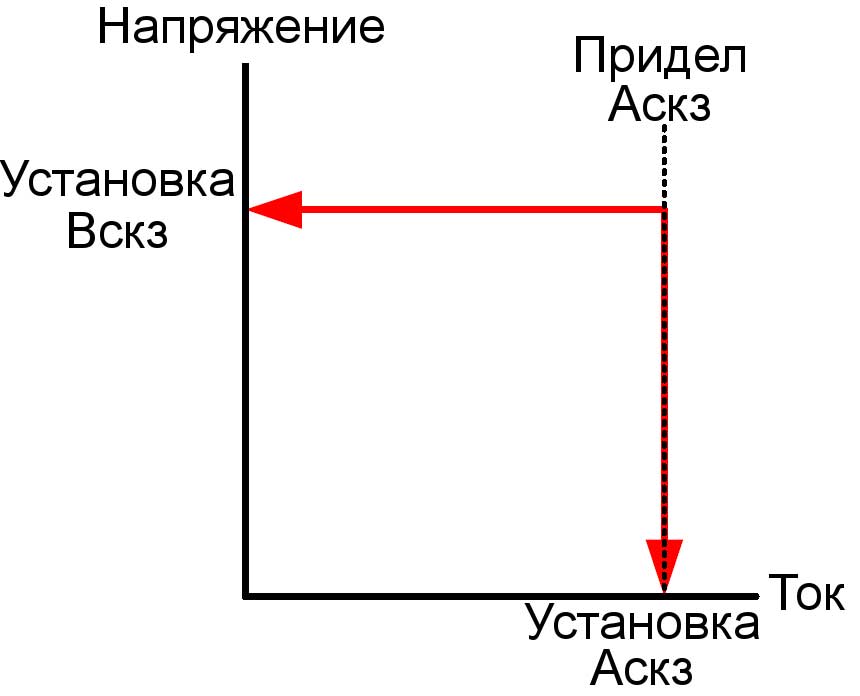 При достижении выходного тока уровня установленного предела Аскз предел источник питания перейдет в режим стабилизации по току, при этом уровень выходного напряжения может изменяться. Когда уровень выходного тока станет ниже установленного предела Аскз предел, источник перейдет обратно в режим стабилизации напряжения.