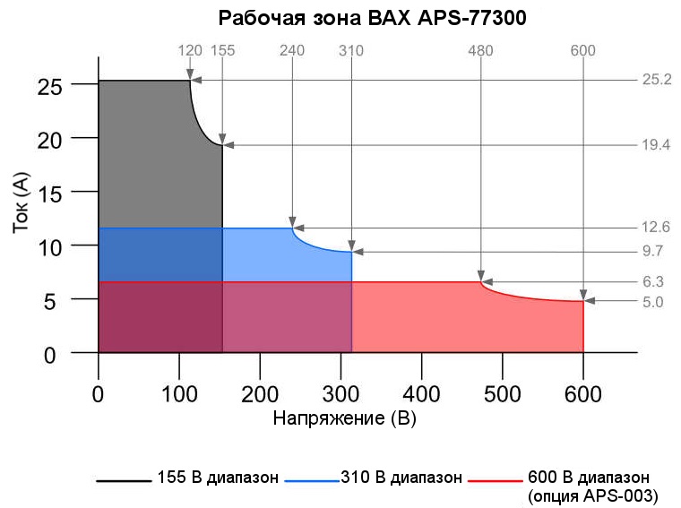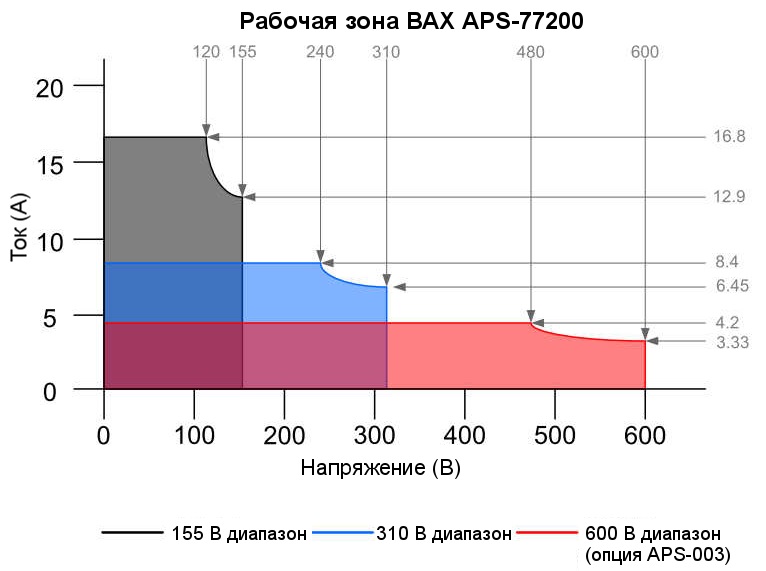 В основе регулировки выходных значений тока и напряжения в новых источников питания лежит нелинейная мультидиапазонная ВАХ (вольтамперная характеристика). Наличие мультидиапазонной регулировки позволяет установить на выходе источников питания требуемое напряжение и/или ток в допустимом диапазоне на максимальной мощности. Ниже представлены графики установки выходных параметров в зависимости от выбранного диапазона напряжения.