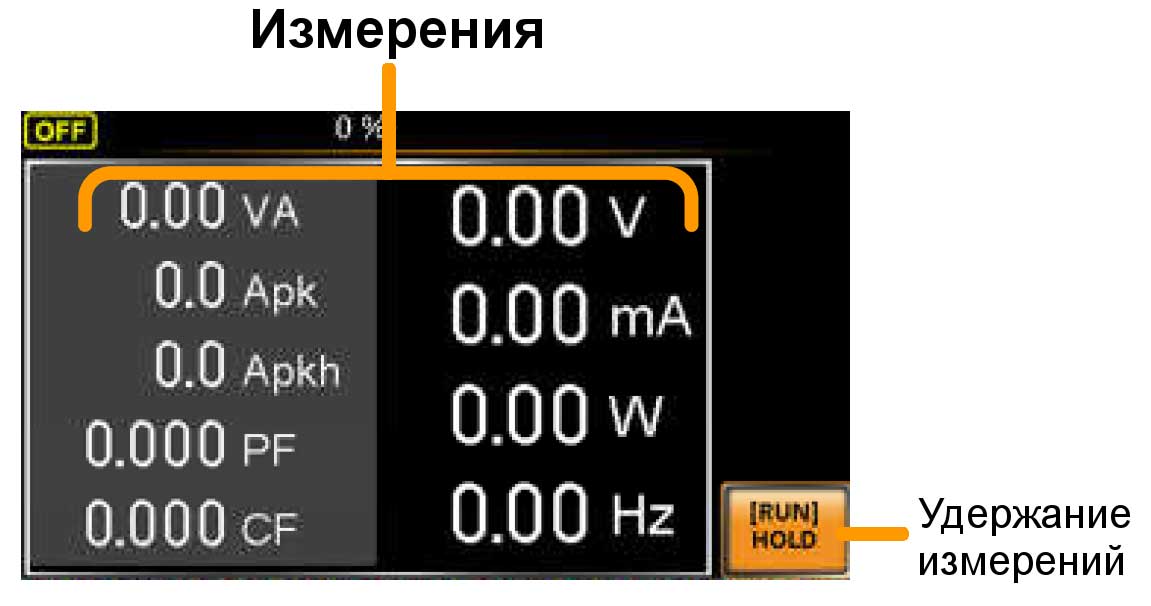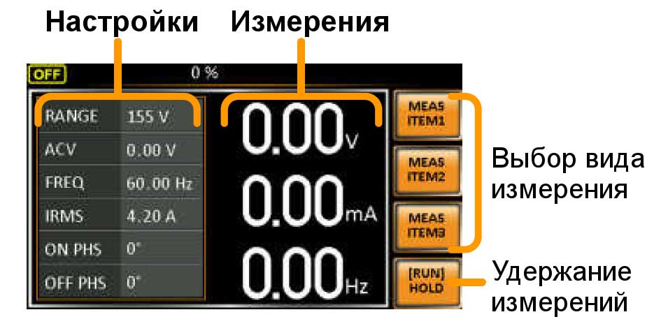 Существует два режима работы панели управления: стандартный режим и простой режим. Примеры обоих режим приведены ниже. Стандартный режим объединяет экран настроек и экран измерителя. Для выбора вида измерения используются функциональные кнопки (F1 ~ F3). В простом режиме, на экране источника отображаются только результаты измерений.