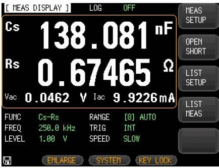 В процессе измерений доступно задействовать встроенный цифровой регистратор (Meas. Log), который использует аппаратную память для записи, хранения и быстрого вывода результатов измерений (внутренний буфер на 10.000 отсчетов). Собранные значения могут быть сохранены пользователем на внешний USB диск в формате .csv. В дальнейшем эти показания можно просмотреть на ПК с помощью прикладной программной оболочки, например Windows Excel. В процессе регистрации (функция LOG активна) - на дисплее отображается экран в статусе измерений (MEAS DISPLAY). При этом настройки функций [FUNC], параметров тест-сигнала (частота/FREQ и уровень/LEVEL) не могут быть изменены и останутся зафиксированными на период сбора данных.