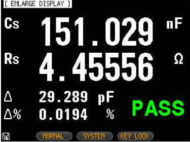 Дисплей LCR-76000 серии в полной мере обеспечивает исчерпывающее информирование пользователя, удовлетворяет его потребности в отображении всех данных для визуального анализа. Например, в режиме MEAS/«Измерения» на дисплее одновременно выводятся настройки параметров теста и результаты измерений. Функция ENLARGE DISP/«Развернуть дисплей» (рис.5) выводит на экран новые детали и доп. характеристики результатов измерений. Для допускового контроля служит функция PASS/FAIL (Годен/Негоден), призванная помочь инженерам-разработчикам быстро получить достоверные результаты измерений по заданным отклонениям от номинала.
