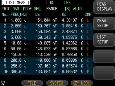 Анализаторы LCR-76000 серии обеспечивают тестирование по 10 последовательным точкам из списка качания (listed test/LIST MEAS). Функция позволяет оператору задать десять значений основного критерия испытаний (частота, напряжение или ток тест-сигнала), а также определить перечень измеряемых параметров (например, Cs - Rs).