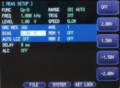 Внутреннее напряжение постоянного смещения (до ±2,5В от внутр. источника – рис.9) позволяет эмулировать взаимодействие переменного и постоянного тока, учитывать их взаимовлияние с целью понимания вариаций емкости конденсатора в процессе его реальной эксплуатации. Даная функция незаменима при измерении варикапов, ёмкость которых зависит от приложенного постоянного напряжения или для тестирования характеристик трансформаторов, параметры которых зависят от степени намагничивания постоянным напряжением.
