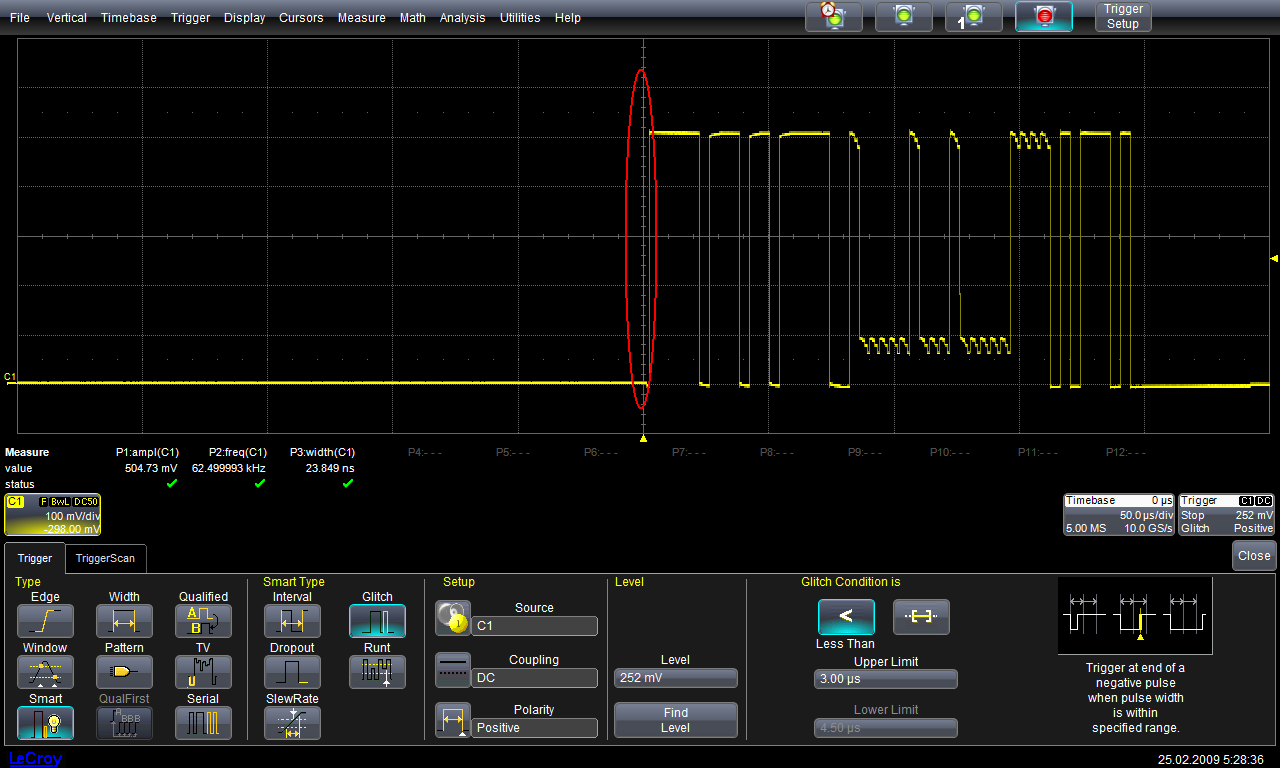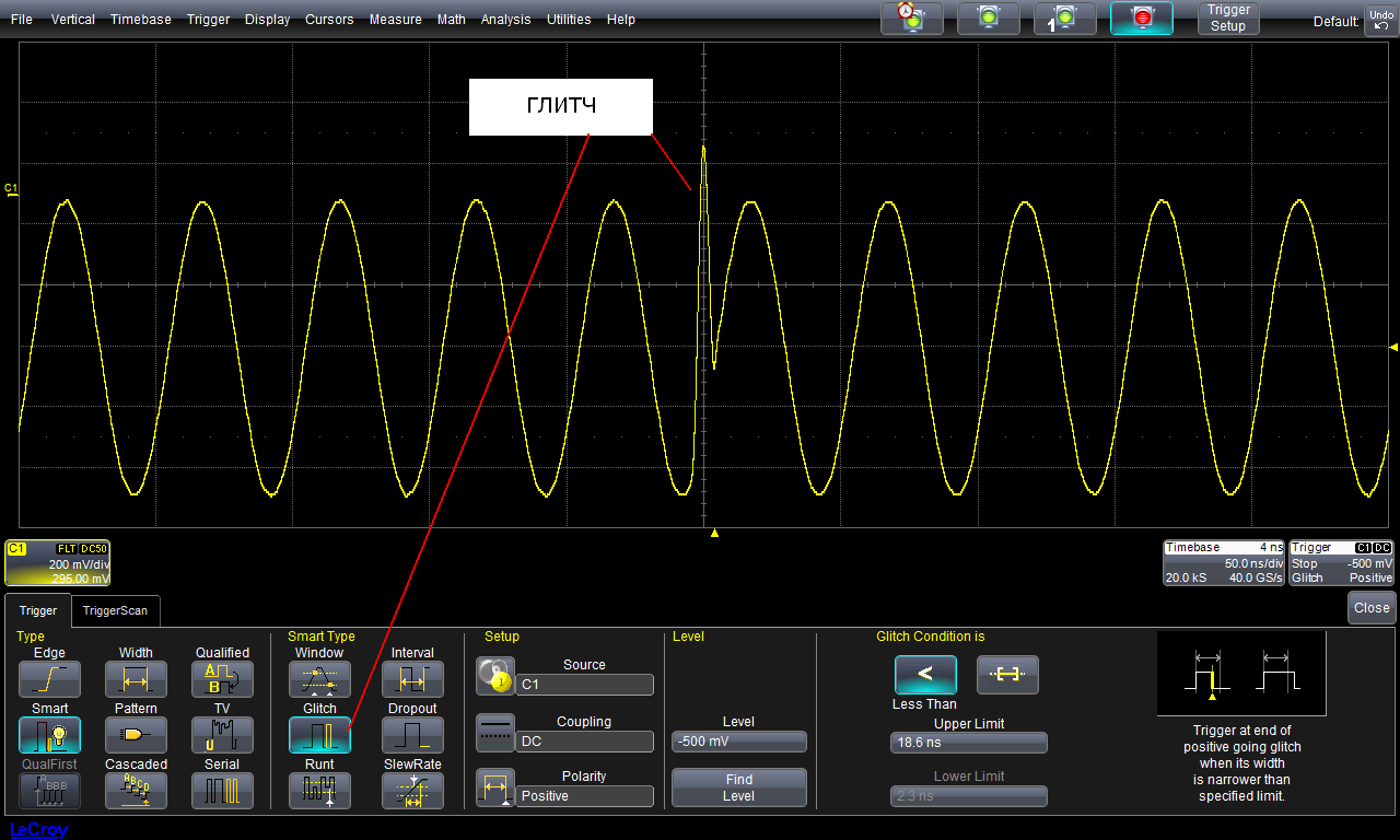 При появлении импульсной помехи (глитча) в сигнале осциллограф LeCroy чётко фиксирует её появление (см. рис. 9)