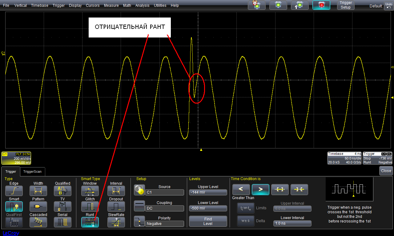 Ещё одной особенностью режима синхронизации TriggerScan™ является то, что при остановке сбора информации, в случае обнаружения аномалий, осциллограф автоматически раскрывает и детализирует меню синхронизации в отношении тех настроек, при которых был зафиксирован артефакт. Так, например, на рис. 3, 4 и 5 представлены осциллограммы захвата артефакта, возникающего в синусоидальном сигнале, и указаны условия (уровни, длительности и пр.), при которых эти артефакты были зарегистрированы.