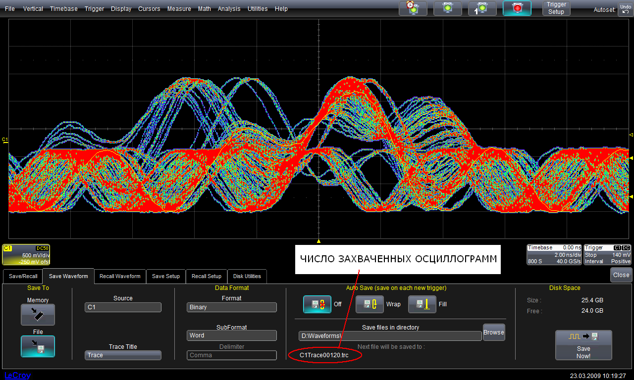 За время сбора 739 секунд осциллограф LeCroy зафиксировал и записал 120 осциллограмм, содержащих аномалии. И это в 40 раз больше, чем предыдущий осциллограф. При этом ещё раз отметим, что первый осциллограф, используя функцию послесвечения, даёт «мёртвую» картинку событий и отличить по полученной осциллограмме, какой сбой был первым, какой вторым, а какой третьим невозможно; воспользоваться автоматическими измерениями параметров невозможно; сохранить отдельные артефакты невозможно и т.д. Осциллограф LeCroy сохранил все 120 артефактов в отдельных файлах с метками времени, когда они проявились. Воспроизводя эти файлы, возможно, осуществить все действия, на которые способен современный цифровой осциллограф при анализе и измерениях входного сигнала.