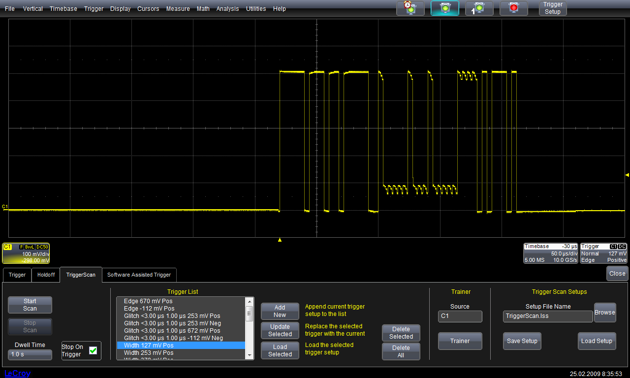 Дополнительно следует отметить, что обучение режима TriggerScan™ и последующий процесс регистрации аномалий могут проходить при разных положениях органов управления, например коэффициента развёртки или коэффициента отклонения. Так на рис. 2 видно, что обучение осциллографа происходит на коэффициенте развёртки 5 нс, память при этом составляет 2 К. Но для увеличения длины памяти осциллографа, например до 256 М, при поиске аномалий в исходном сигнале необходимо увеличивать значение коэффициента развёртки. При этом режим TriggerScan™ полностью сохраняет свои функциональные способности, но появляются дополнительно возможности. Например, на очень длинных промежутках времени предзапуска или послезапуска можно наблюдать поведение объекта исследования до и после появления аномалий, а так же сократить мёртвое время осциллографа за счёт применения длинной памяти. Использование режима послесвечения в этом случае даст полную засветку экрана без выделения каких-либо участков сигнала. Также имеется возможность использовать другие инструменты поиска, измерений и анализа сигналов на длинной памяти, например WaveScan™, существенно расширяющие возможности цифрового осциллографа (см. {4}).
