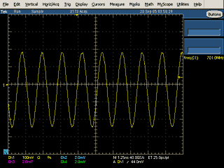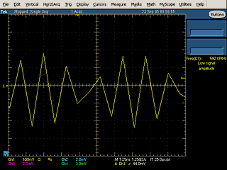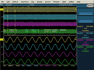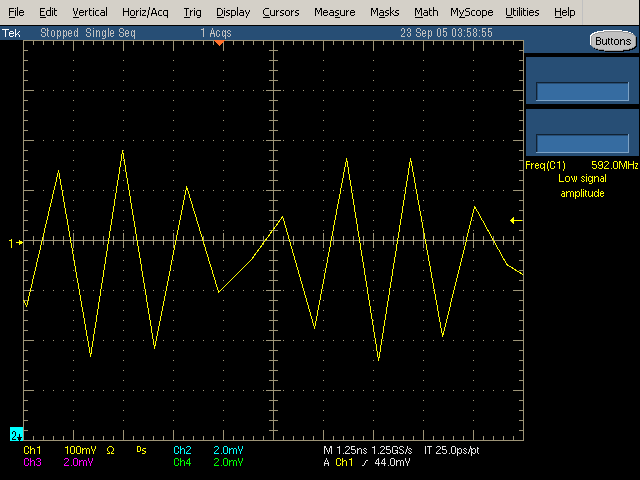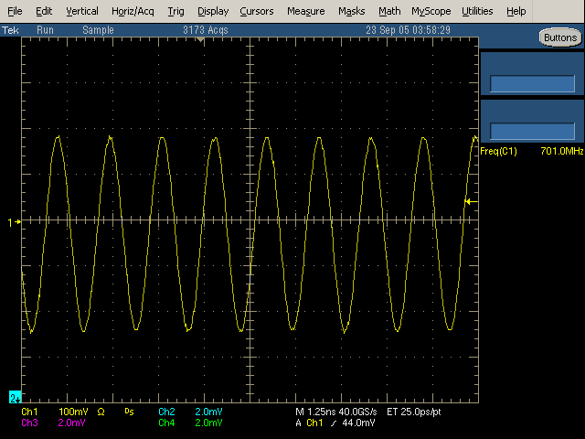 TDS-5104 B прекрасно показывает синусоидальный сигнал, но вот только его частота где-то около 250 МГц…. и это в 4 раза меньше исходного сигнала…это кажется называется «стробоскопический эффект»…Это и есть результат нарушения соотношения частоты дискретизации и сигнала с частотой равной полосе пропускания.