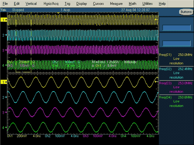 К чему приводит нарушение условий теоремы Котельникова? Для этого на осциллограф TDS-5104 B, имеющий полосу пропускания 1 ГГц, подадим на все четыре канала сигнал частотой 700 МГц (а это 0.7 от полосы пропускания) в режиме эквивалентной дискретизации – результат приведен на рисунке 4.