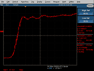 Цифровой запоминающий осциллограф (ЦЗО) достаточно достоверно воспроизводит крутые фронты (сопоставимые с собственным временем нарастания) при однократном пуске развертки при линейной интерполяции при соотношении частоты дискретизации и полосы пропускания равном 10. Этой характеристикой и обладает осциллограф Tektronix. TDS-3054В (тут должны звучать бурные аплодисменты). Даже при использовании всех четырех каналов соотношении частоты дискретизации и полосы пропускания все равно остается больше 10 (тут должны звучать еще более бурные аплодисменты, чем раньше). При соотношении менее 10 начинается все большее и большее искажение фронта сигнала, которое приводит к недостоверному измерения времени нарастания (или спада) при однократном пуске. У осциллографов LeCroy WaveSurfer-454 соотношение частоты дискретизации и полосы пропускания в двух-канальном режиме равно 4, а в четырех канальном режиме равно 2. Здесь было бы не лишне вспомнить о теореме Котельникова, утверждающей, что «для достоверного отображения сигнала с конечным спектром, частота дискретизации сигнала должна быть в два раза выше частоты исходного сигнала». Итак осциллограф LeCroy WaveSurfer-454 имеет полосу пропускания 500 МГц, а частота дискретизации в 4-х канальном режиме равна 1Гвыб/с, что точно соответствует условиям теоремы Котельникова. Очевидно, что условия теоремы Котельникова, в данном случае могут обеспечить восстановление частоты исходного сигнала, но форма сигнала будет отображена условно.