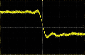 Сравнение нормального (слева) и режима быстрого обновления данных (справа) экрана на конкурентном приборе. В нормальном режиме используется коррекция с помошью цифровой обработки сигнала, что увеличивает полосу пропускания прибора и программно стабилизирует точку запуска. В режиме быстрого обновления цифровая обработка сигнала выключена. | |