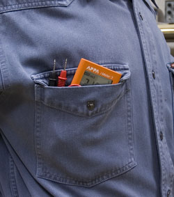 Оригинальный чехол позволяет зафиксировать тестовые провода, а также обеспечить крепление прибора при проведении измерений и транспортировке, даже при размещении в нагрудном кармане верхней одежды (см. рис.) или халата.