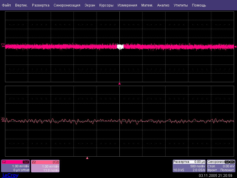 Визуально, мин/макс уплотнение выделяет значительные пики в ряду данных. Когда отображается линия развертки при закороченном входе, уплотненная осциллограмма будет выглядеть более зашумленной, чем тот же сигнал, наблюдаемый на неуплотненном экране. Этот эффект на осциллографе LeCroy WS 454 показан на рис. 2. Данные в верхней развертке уплотнены по 10 тысячам точек для вывода на экран. При этом отображаются минимальные и максимальные значения, что позволяет легко найти и рассмотреть пиковые значения, используя растяжку. Растянутая развертка является менее зашумленной из-за разделения пиковых значений. Необходимо отметить, что уплотнение экрана не изменяет амплитуду сигнала, оно просто выбирает наибольшие пики и выводит их на экран.