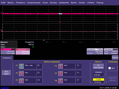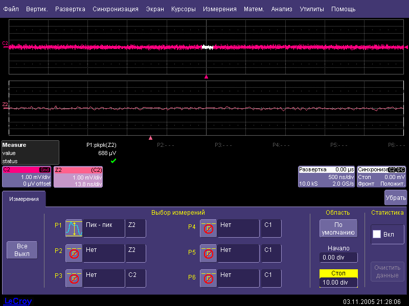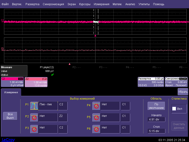 Рисунок 3. Измеренное пик-пик значение растянутого сигнала (Z2) равно 625 мкВ |