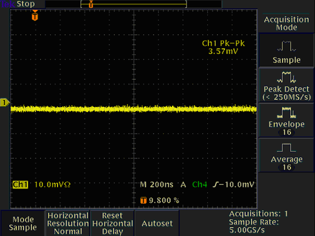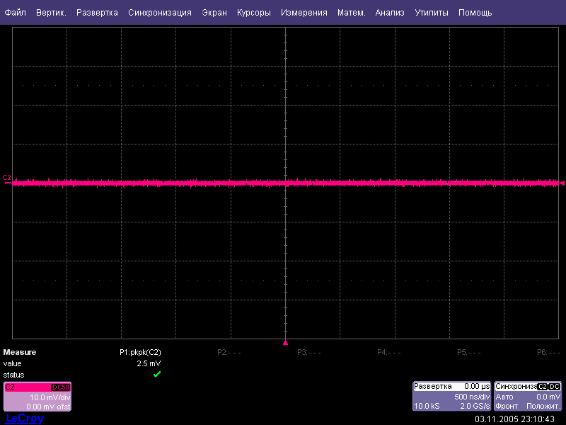 Если вы выбрали для использования при сравнении различных осциллографов пиковые измерения, вы должны иметь гарантию, что сравниваемые линии развертки имеют равное количество точек данных. Рисунки 2 и 3 показывают сравнение при измерениях шумовой дорожки на LeCroy WS 454 и Tektronix TDS 3054. Оба осциллографа установлены в режим сбора 10 тысяч точек на развертку. TDS 3054 показывает чуть более высокое пиковое значение шума для данного коэффициента отклонения. Обычно, измеренное значение шума будет изменяться в зависимости от установленного коэффициента отклонения, так же как и от выбранного канала. Как для любых измерений случайных явлений, вы должны использовать статистические параметры для определения среднего значения по множеству разверток.