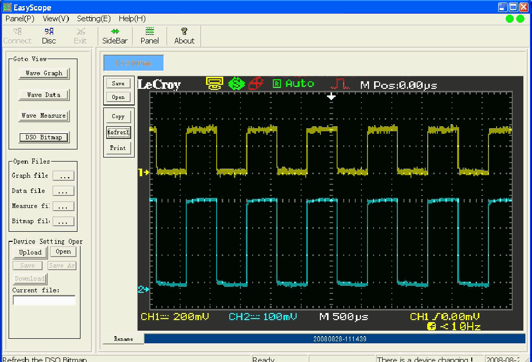 Программное обеспечение EasyScope (рис. 15), поставляемое в составе прибора позволяет осуществлять дистанционное управление осциллографом через виртуальную панель управления, в том числе в режиме допускового контроля. Широкий перечень настроек и удобный выбор требуемого контекстного окна обеспечивают лёгкий доступ к измеренным параметрам, быстрое сохранение осциллограмм непосредственно на персональный компьютер в виде графических файлов (bmp.) или массивов данных (bin./csv.). Для этого предназначены соответствующие разделы-закладки «Wave Measurements», «Wave Graph», «Wave Data».